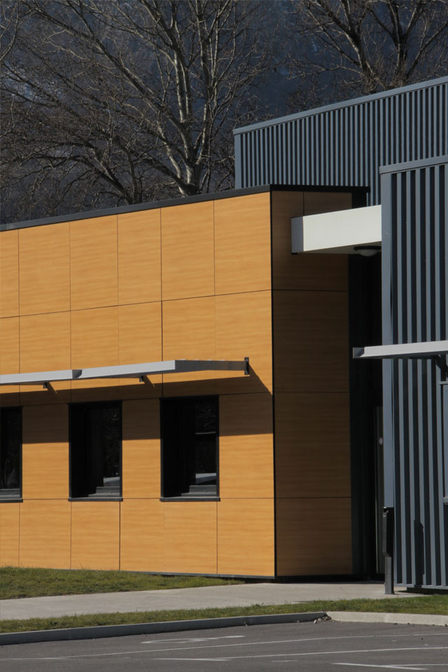 Ce deuxième volume est recouvert tantôt d’un bardage métallique identique aux ateliers, tantôt d’un bardage composite (teinte bois) afin de mettre en valeur cette partie de l’édifice.